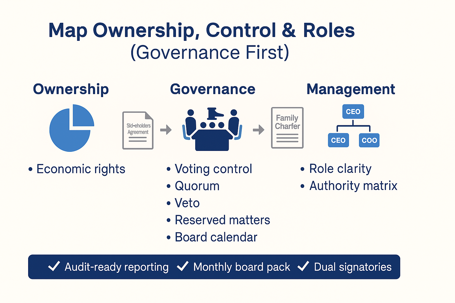 Begin by separating who owns, who governs, and who manages—three different levers that often get tangled. Update the cap table, voting rights, quorum/veto rules and “reserved matters,” then align the shareholders’ agreement with reality and future intent. Capture family expectations in a short family charter (dividends, employment, conflict resolution), and—where helpful—split economic rights from voting control so active leaders can run the company while non-operating heirs receive fair participation. Tie this to estate planning (wills/trusts; wasiat/hibah where relevant) to avoid fragmentation. Establish a simple board calendar and monthly reporting pack to create an auditable rhythm—before you draft the buy-sell or move cash under the liquidity plan.