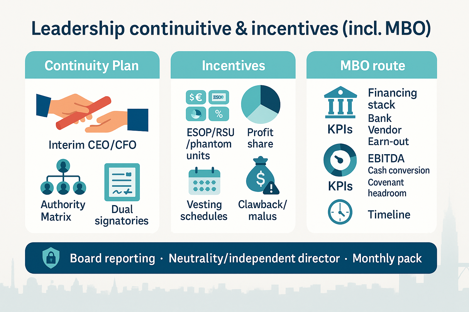 An MBO can fit when the team is proven, lenders support the deal, and free cash flow can service debt without starving operations. Tie the MBO term sheet to the same valuation method as your buy-sell, use auditable KPIs for any earn-out, and maintain dual signatories and covenant reporting. (General information only.)