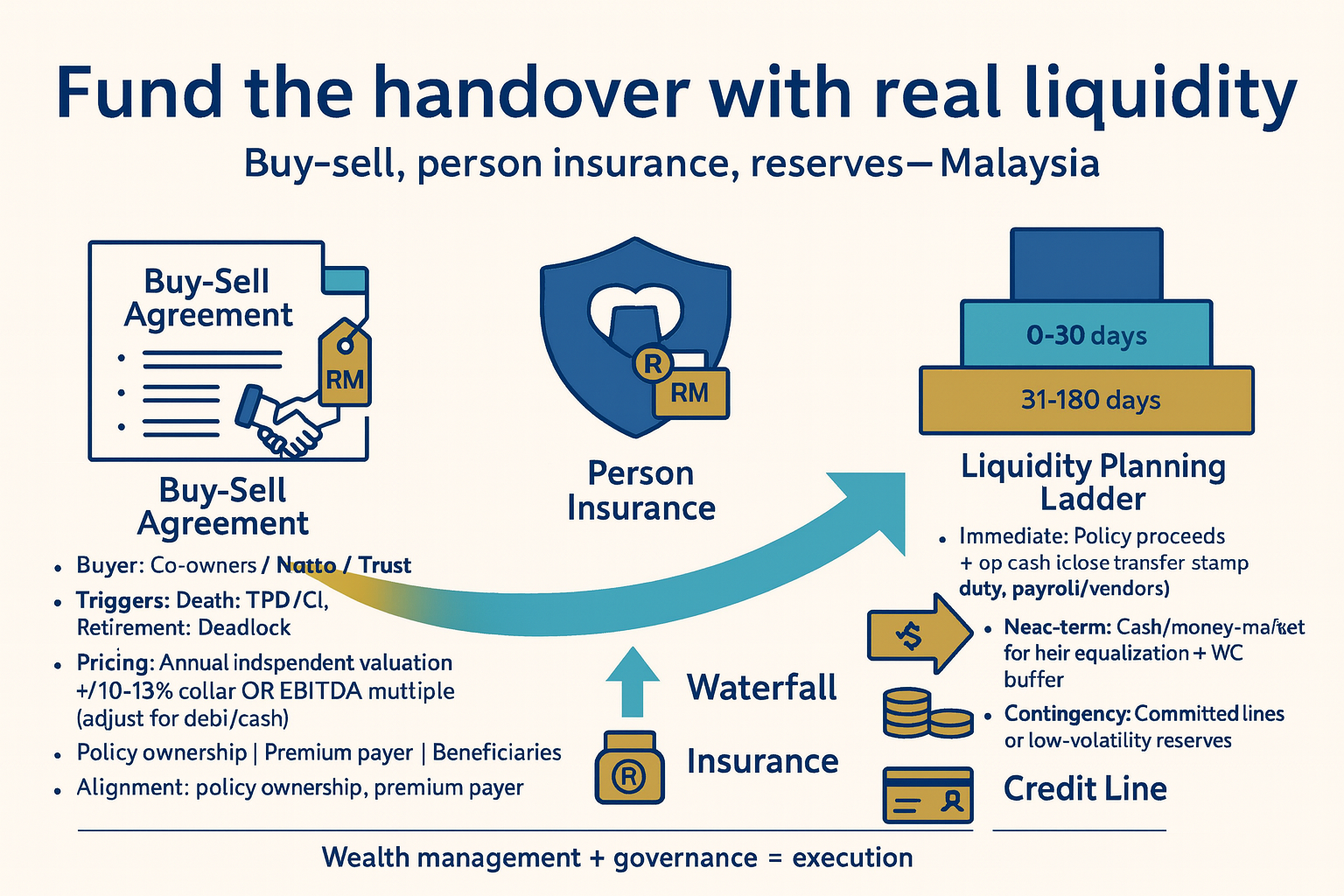 In Malaysia, effective wealth management turns business succession planning into a funded, testable system—not just a handover memo. It links documents to money and people: liquidity planning to cover transitions, protections such as keyman insurance (key-person cover) to maintain steady cash flow, and board-level governance to ensure predictable decisions. Done well, the plan strikes a balance between family fairness and business continuity, paving the way for options such as a management buyout or a gradual family transfer without disrupting operations.