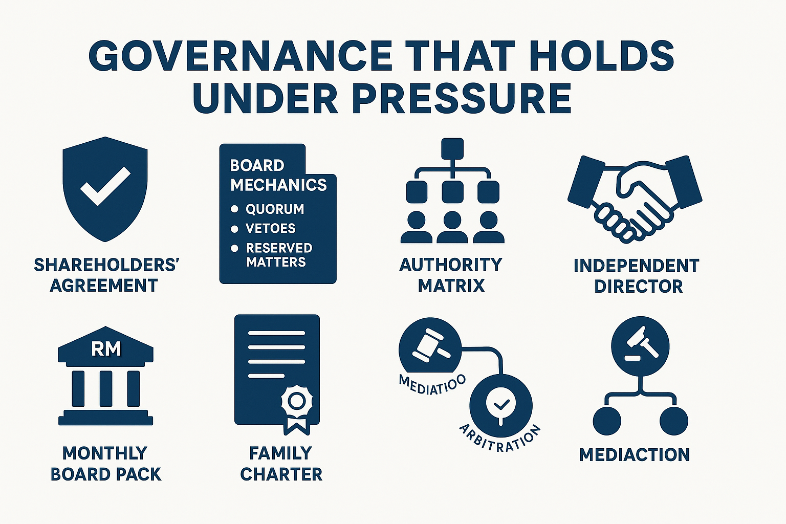 Tie quorum, vetoes, reserved matters, tag/drag, and pre-emption to the succession map you designed. Add a 90-day authority matrix for the interim: who can sign payroll, capex, vendor changes, and bank instructions. Require dual signatories on critical banking until the transition completes, and set a clear deadlock path (chair’s casting vote → mediation → arbitration). Add an independent director to anchor neutrality and cadence. Make transparency routine with a monthly board pack (P&L, cash, covenant headroom, KPIs, progress on buy-sell steps, policy status).
