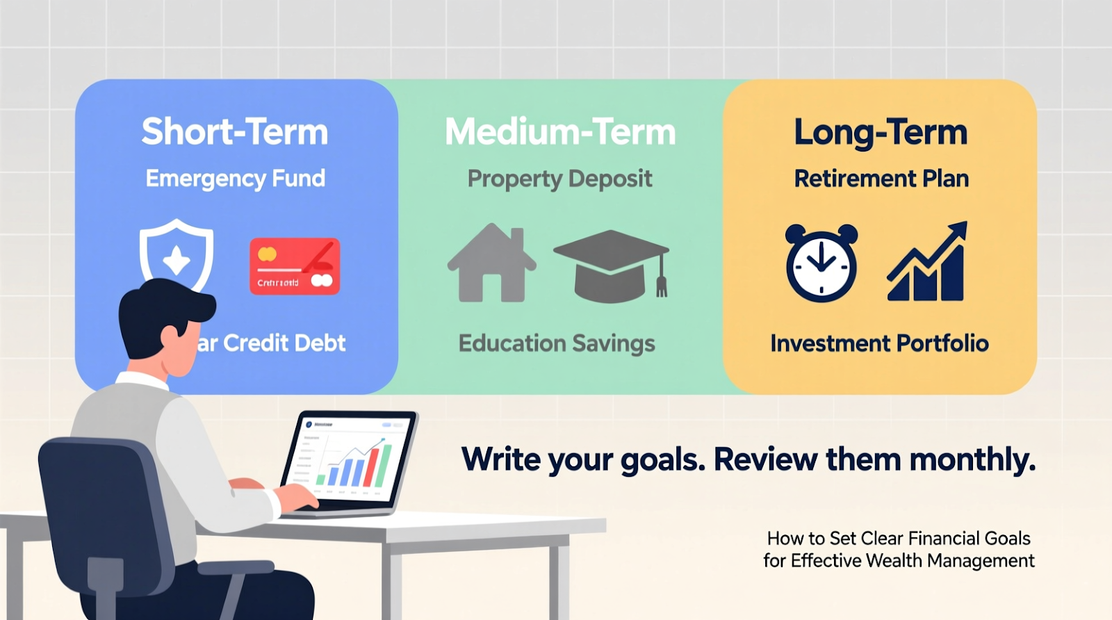 Clear goals support discipline and direction. Goals guide your monthly decisions and help you track progress. Write your goals and review them often. Studies show that written goals increase completion rates because they stay visible in your daily routine. When you set financial goals, divide them into short-term, medium-term and long-term categories. Short-term goals include building a starter emergency fund or clearing a credit balance. Medium-term goals include saving for a property deposit or planning for education. Long-term goals include retirement planning or long-term investment portfolios.